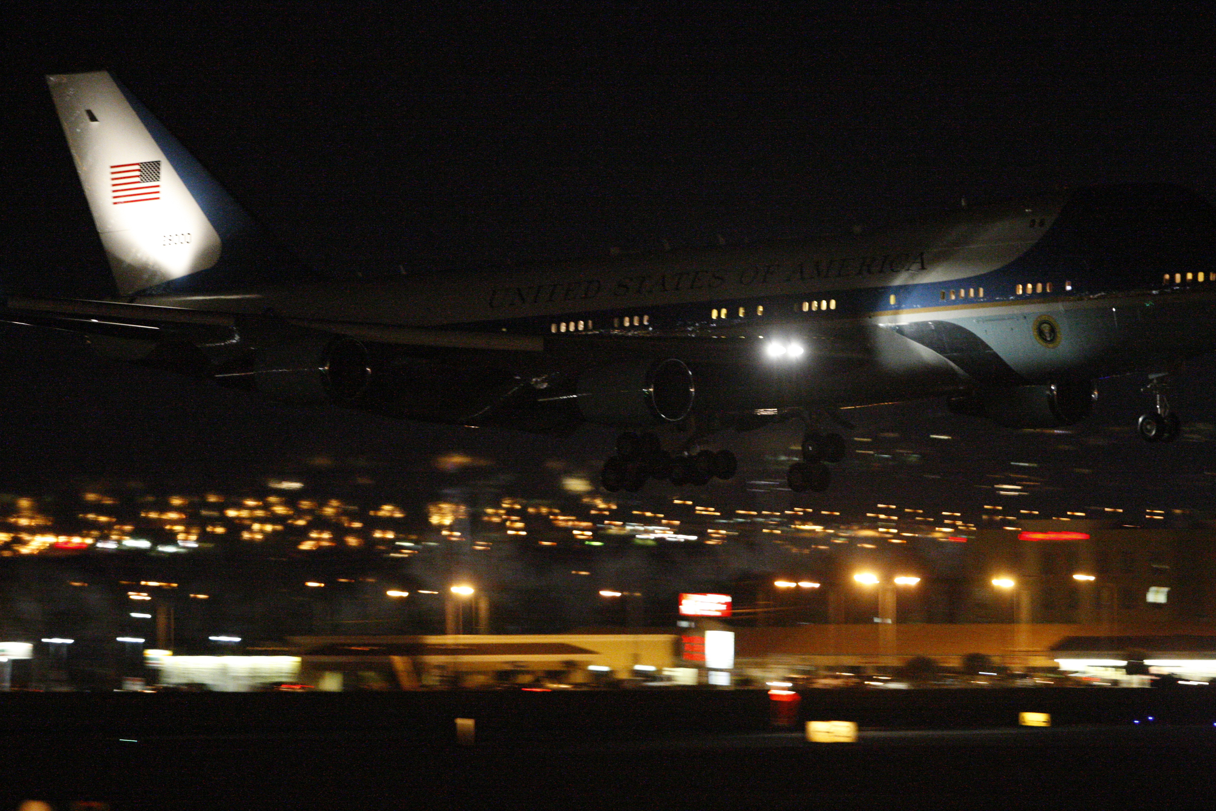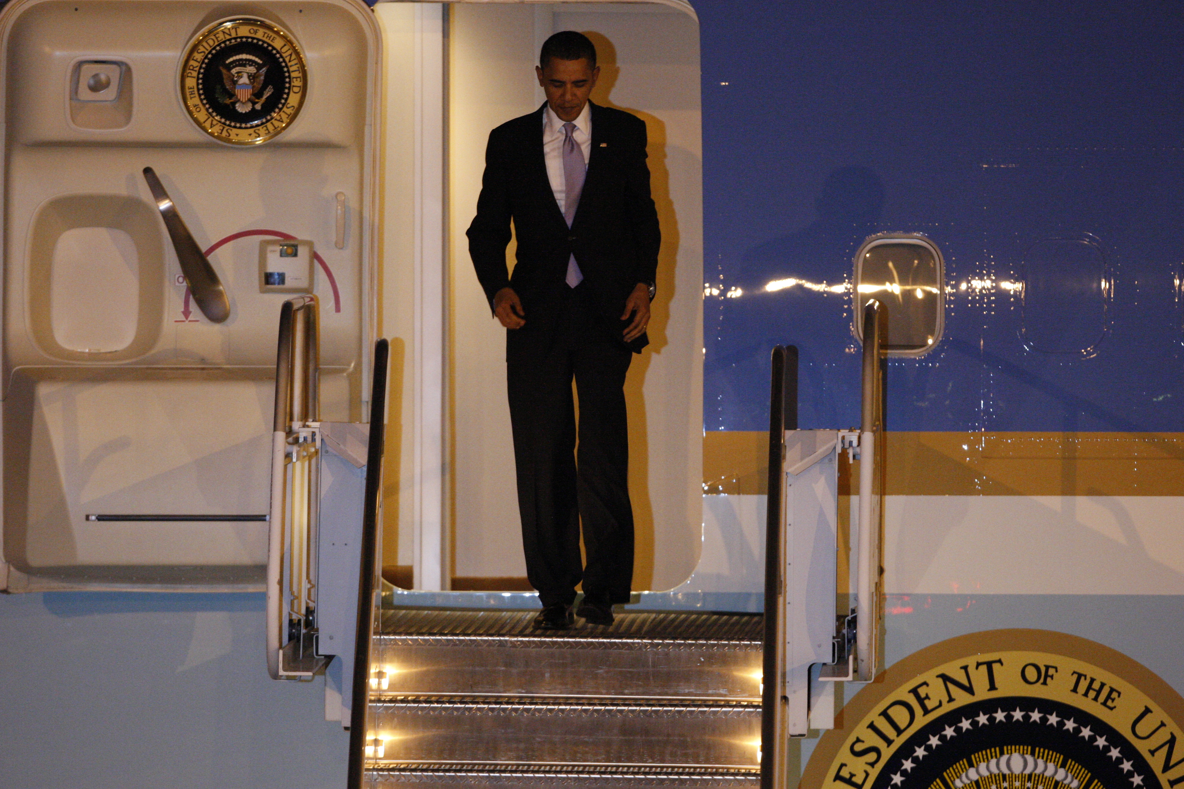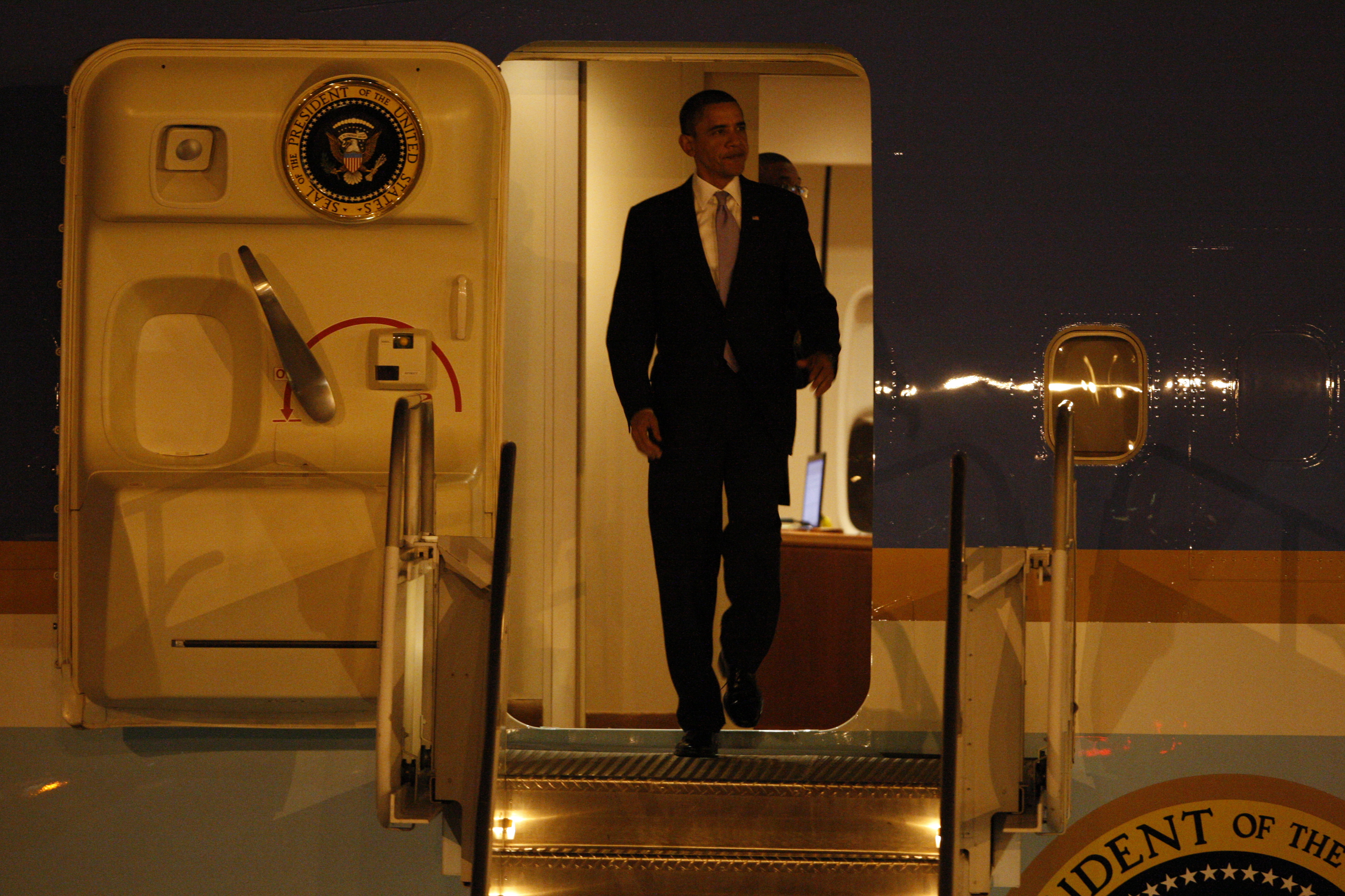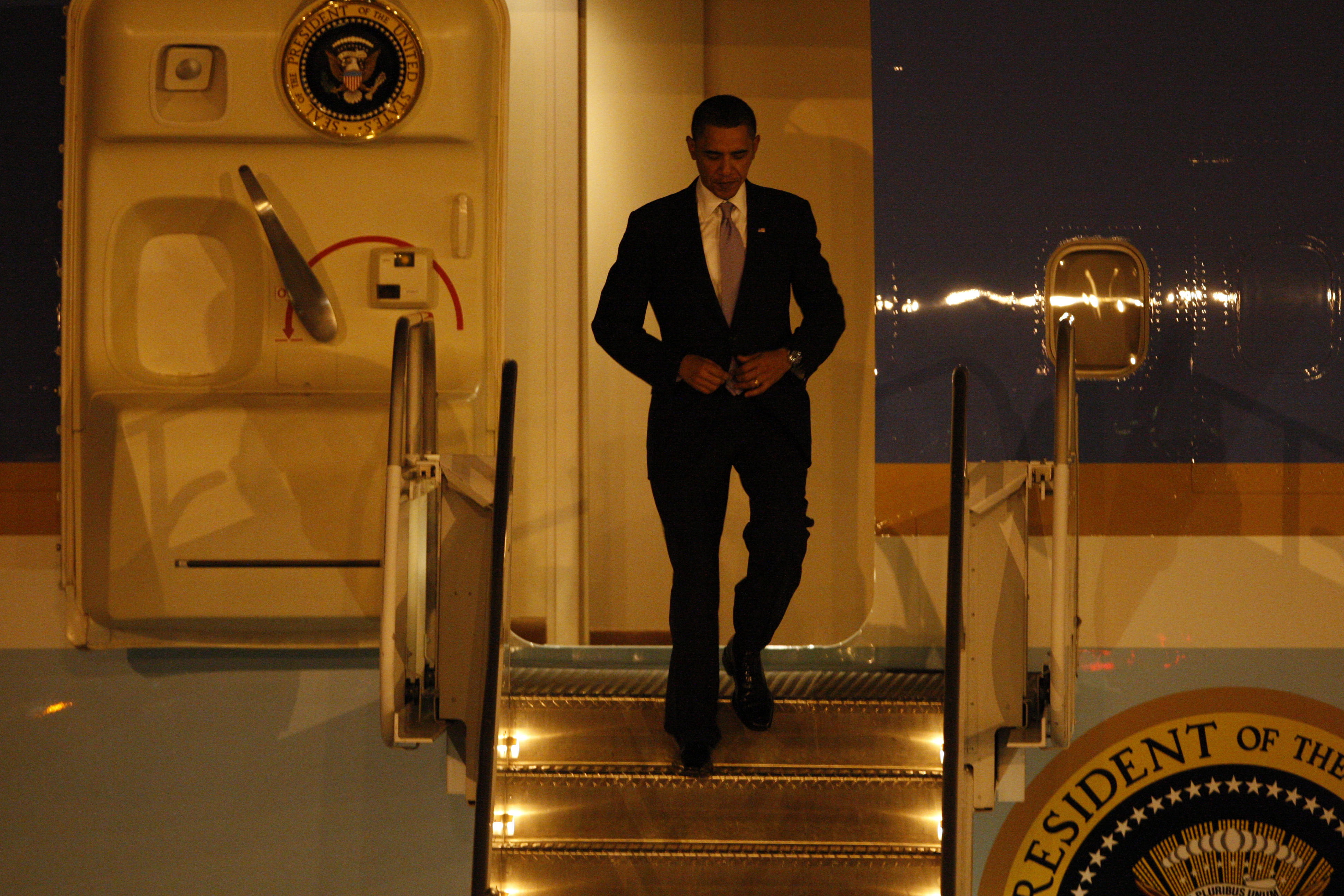 President Barack Obama waves from Air Force One as he arrives at McCarran International Airport Thursday, Feb. 18, 2010, for a series of events and discussions in the Las Vegas Valley. Events will include a town hall meeting on jobs and the economy at Green Valley High School at 10 a.m. Friday.