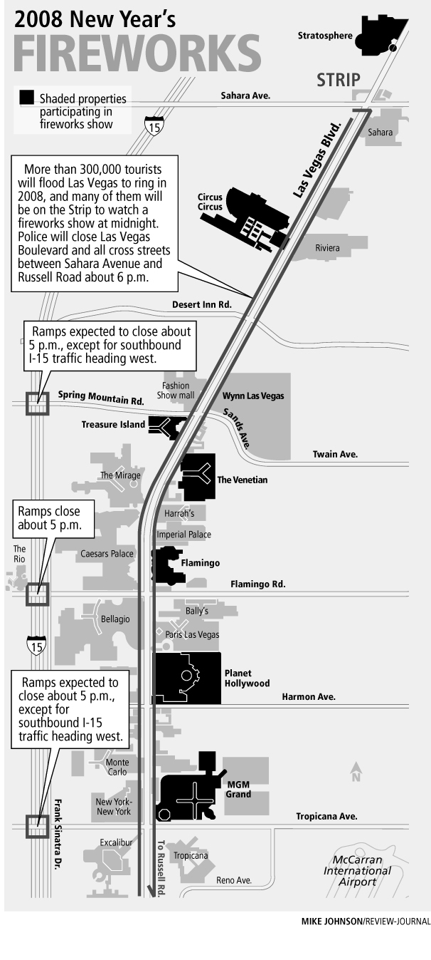 Tourism officials expect about 303,000 people to visit Las Vegas to ring in 2008. Many of them will be on the Strip, where Las Vegas police will maintain their usual presence.