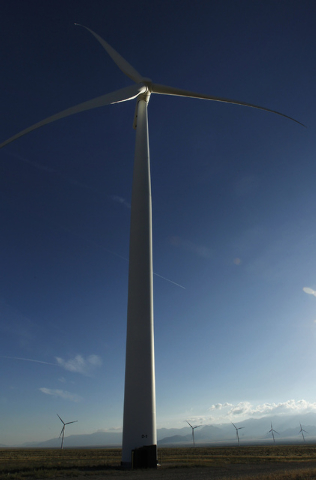 The $225 million project went online in August 2012 as the first utility-scale wind farm in Nevada. It features 66 turbines scattered across more than 7,600 acres of federal land at the heart of the vast Spring Valley, which runs north-south for about 110 miles between the Schell Creek and Snake mountain ranges in eastern Nevada.