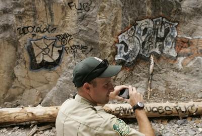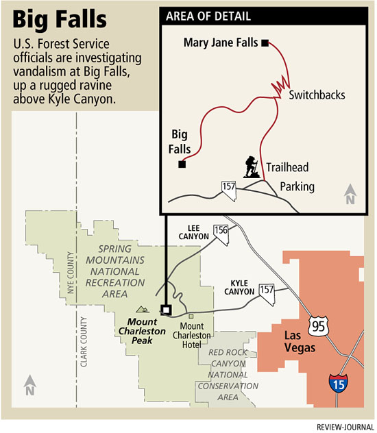 The base of the once-pristine rock walls that tower to the sky just inside the Mount Charleston Wilderness Area up a rugged ravine above Kyle Canyon have been marred with 12-foot-long swaths of blue, white, orange and black spray paint. It's similar to the graffiti that vandals leave along Las Vegas freeways.