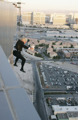 Even though it was a controlled drop, using a high-speed cable winch similar to those used in "Spider Man" films, it was still a wild ride for the 57-year-old thrill-seeker who has survived at-sea hot-air balloon crashes and rappeling stunts. Seconds into the drop, he released thousands of dollars worth of airline tickets, which appeared to head for Las Vegas Boulevard in the strong wind.