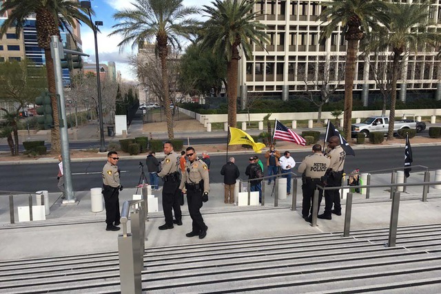 The high-profile nature of the trial drew an increased police presence to the Lloyd George U.S. Courthouse. In the morning, several protesters stood outside with megaphones, the American flag and the Gadsden flag in a show of support for the defendants.