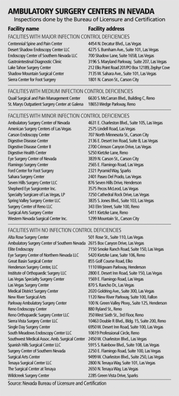 Seven facilities, most notably the Endoscopy Center of Southern Nevada at 700 Shadow Lane, were found to have major deficiencies. During an inspection of the facility in January, Southern Nevada Health District officials discovered nurse anesthetists reusing syringes on patients carrying hepatitis C and contaminated single-dose vials of medication used on multiple patients.