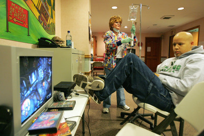 His right arm was connected to two IV bags, one containing chemotherapy and the other a liquid to keep him hydrated.