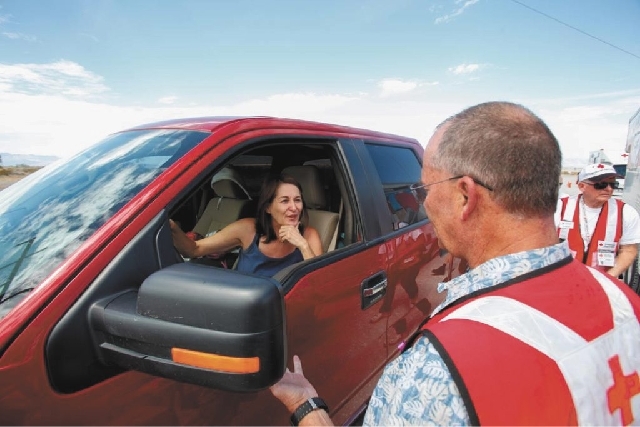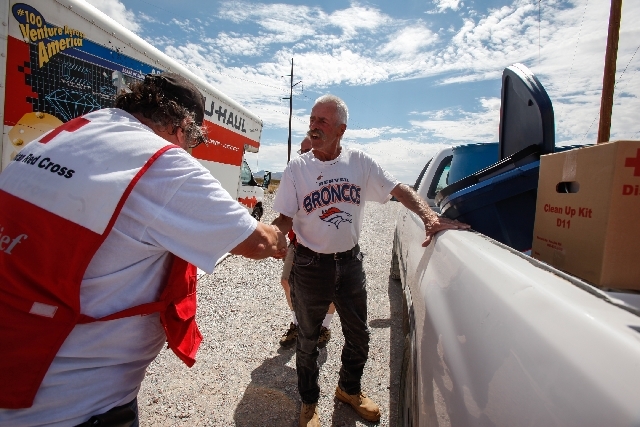 With no running water available for those re-entering Trout Canyon, American Red Cross volunteers were handing out water at the checkpoint for residents. They also provided items for clean up, such as rakes and shovels, and breakfast sandwiches, among other things to those going to their residences.