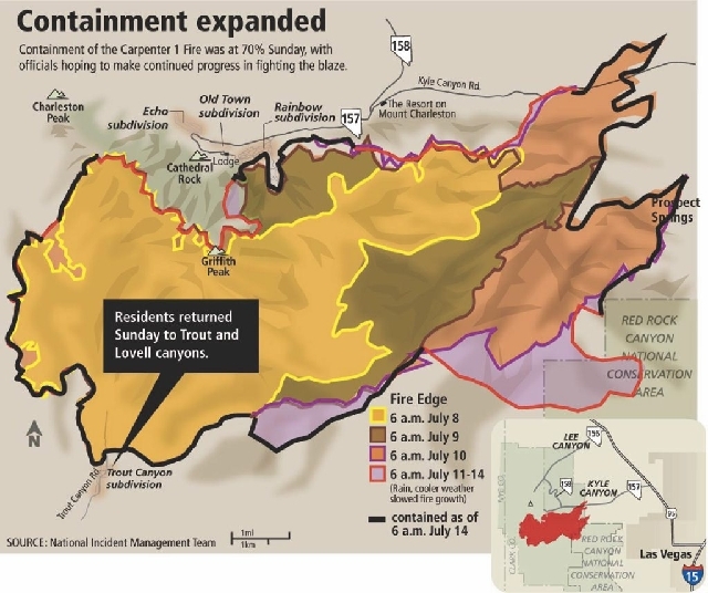 Fire crews have contained most of Carpenter, Lee Spring, Trout and Lovell canyons, as well as areas of Harris Spring and Kyle canyons. The containment area is surrounded by about 60 miles of trenches, mostly dug by shovel.