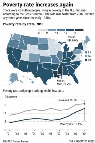 The overall poverty rate climbed to 15.1 percent, from 14.3 percent the previous year, and the rate from 2007-2010 rose faster than for any similar period since the early 1980s when a crippling energy crisis amid government cutbacks contributed to inflation, spiraling interest rates and unemployment. For last year, the official poverty level was an annual income of $22,314 for a family of four.