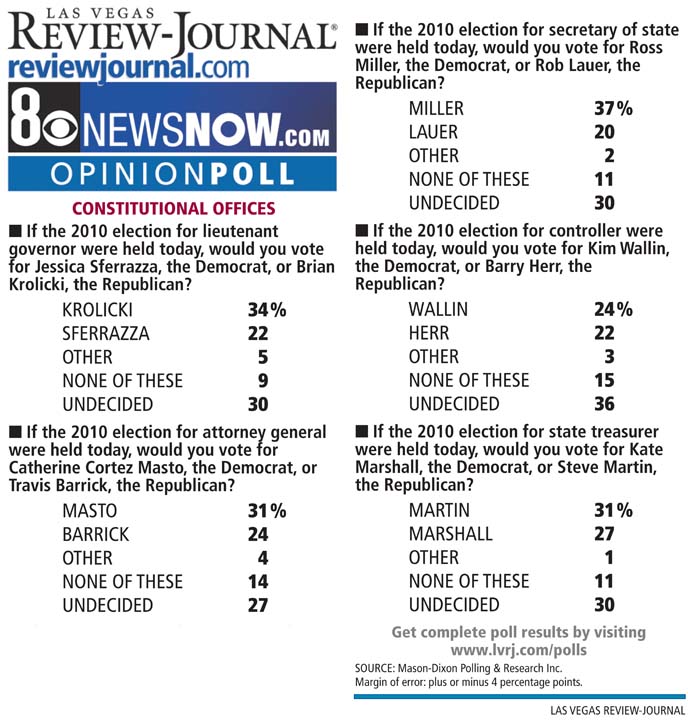 The poll shows two incumbents have solid, double-digit leads -- Republican Lt. Gov. Brian Krolicki and Democratic Secretary of State Ross Miller. Krolicki holds a 12 percentage point lead over Democrat Jessica Sferrazza, while Miller is ahead by 17 percentage points over Republican Rob Lauer.