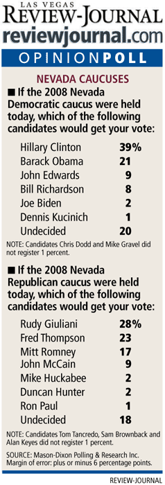 If Nevada’s presidential nominating caucuses were held today, the winners would be Hillary Clinton on the Democratic side and Rudy Giuliani among Republicans, according to a new Review-Journal poll.