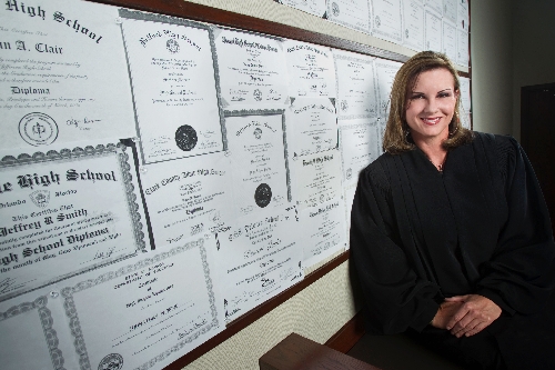 Henderson Municipal Court Judge Diana Hampton has 65 diplomas and GEDs hanging on a wall in her courtroom that she required young offenders to obtain.