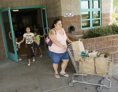 Stacie Coulter and her four children were back at Catholic Charities of Southern Nevada's Community Food Pantry on Friday afternoon to pick up their monthly cart of groceries.
