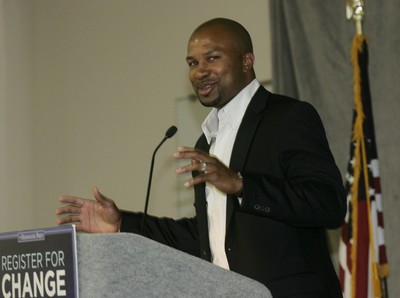 His speech was the kickoff for a voter registration drive, with volunteers fanning out into neighborhoods afterward. He's on a cross-country tour that began in President Bush's hometown of Crawford, Texas, as Democrats try to convince voters that Bush and the Republicans' presumptive nominee, John McCain, are one and the same.