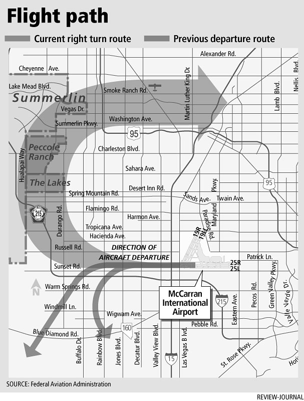 Kell Houston, who lives near The Lakes, south of Sahara Avenue, complained that he has had to tolerate bursts of jet noise at random times since the right turn went into place.