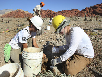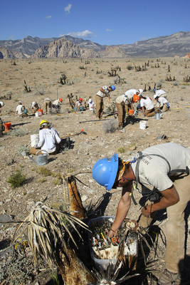The sound of picks and shovels pounding the hard Mojave Desert soil signaled the return of plant life Tuesday to the core of Red Rock Canyon's scenic loop.