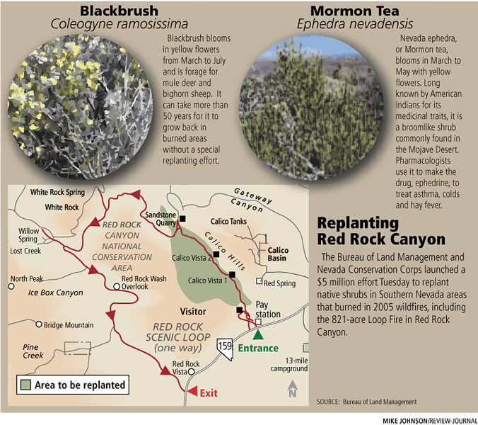 It marked the initial strike by public lands managers of a $5 million effort to put blackbrush and Nevada ephedra, or Mormon Tea, back on the road to recovery there and in three other burned areas in Southern Nevada including those scorched by wildfires at Gold Butte near Mesquite, 75 miles northeast of Las Vegas.