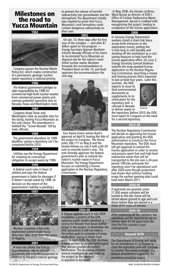 The license application represents a milestone once thought out of reach for the project that was conceived more than 25 years ago to locate a resting place for 77,000 tons of spent nuclear fuel from commercial power plants and highly radioactive waste generated by the U.S. military.