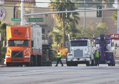 Because of construction on Interstate 15, the truck driver was following a designated detour that brought him to the intersection. The truck toppled as it turned left from eastbound Charleston to northbound Lamb, he said.