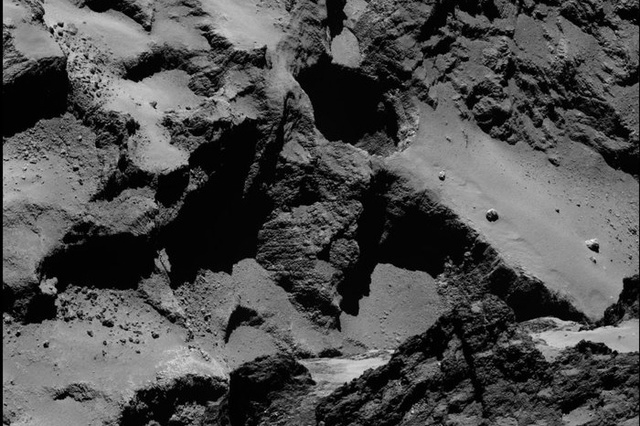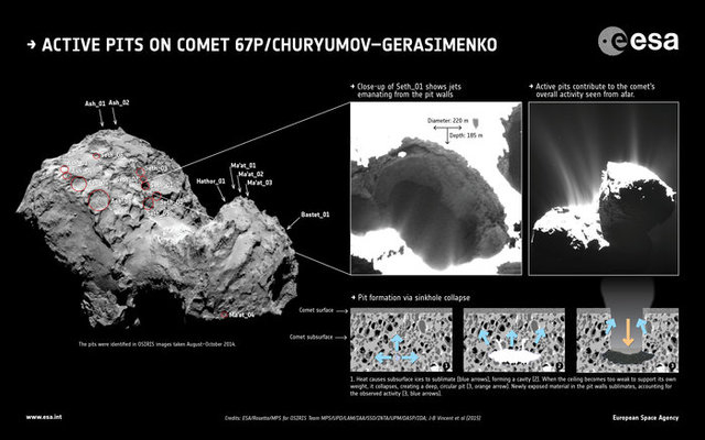 “A number of the dust jets emerging from Rosetta’s comet can be traced back to active pits that were likely formed by a sudden collapse of the surface,” a statement from the ESA reads. “These ‘sinkholes’ are providing a glimpse at the chaotic and diverse interior of the comet.”