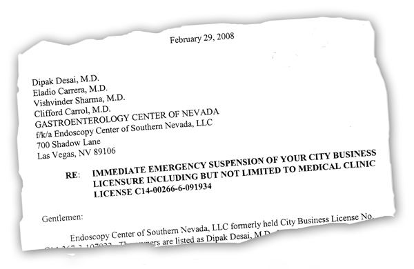 According to records on file with the city's business license division, the same principals -- Drs. Desai, Vishvindi Sharma, Eladio Carrera and Clifford Carrol -- have run endoscopy centers at 700 Shadow Lane since 2000 licensed under the names Endoscopy Center of Nevada Ltd. and Endoscopy Center of Southern Nevada.