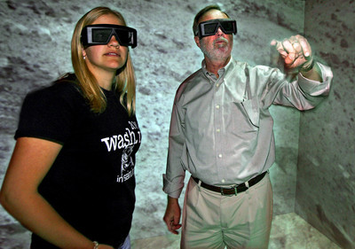 But in the Fossett Laboratory for Virtual Planetary Exploration, researchers can don special glasses, step into a chamber with a white floor and surrounded by three white screens, and direct a computerized system to project planetary images around and beneath them.