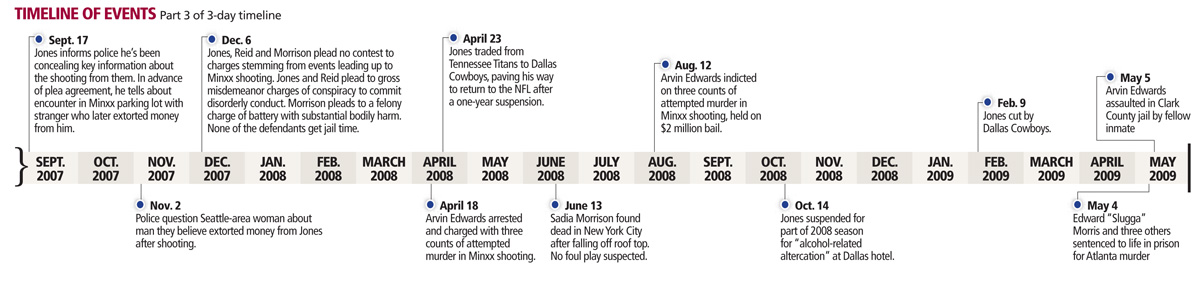 With the investigation at a standstill by summer 2007, police arrested Jones and two others on felony charges for the fight inside the club before the shooting. Around this same time, Jones was slapped with a suspension for the 2007 NFL season.