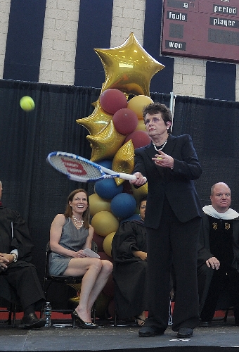 She called over the three graduates who were standing by with her racquet and a basket of balls. When she started hitting, the crowd jumped to their feet and started cheering, hoping to get an autographed ball from the six-time Wimbledon singles champ.