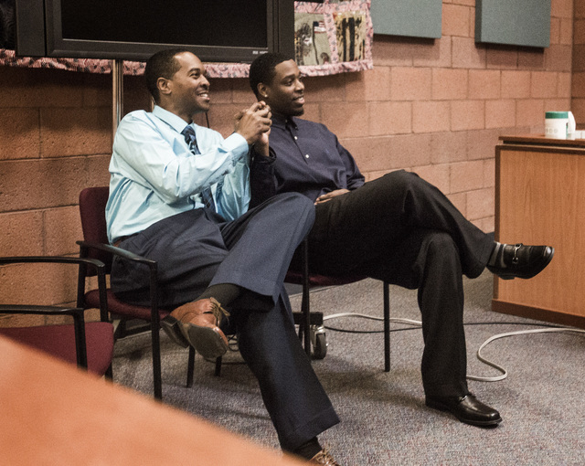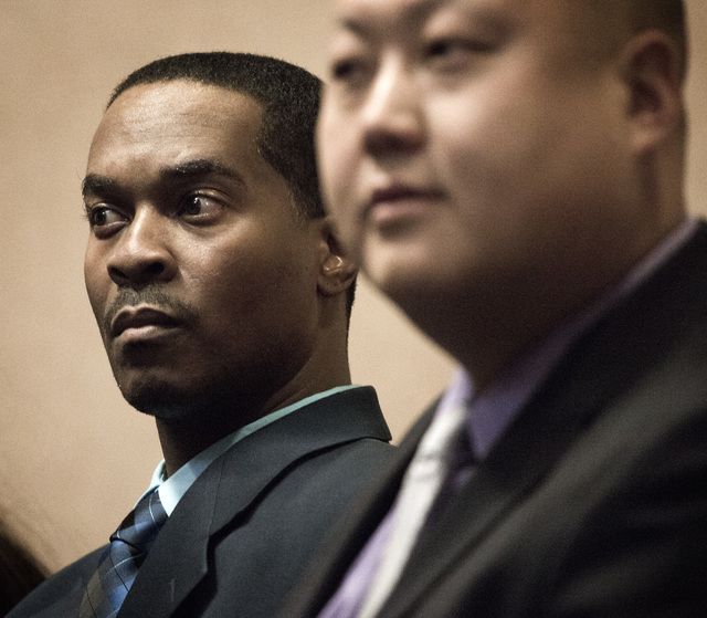 Deon Derrico, left, father of the famed Las Vegas quintuplets, appears in North Las Vegas Justice Court on Wednesday, April 2, 2014. Derrico, 43, is facing 13 felony and three gross misdemeanor charges from the Nevada attorney general’s office for his role in an alleged quitclaim title theft scam. Derrico is accused of forging homeowners’ signatures on deeds. The hearing was continued because Derrico’s co-defendant, Olujuwon Bryant, 23, changed lawyers. (Jeff Scheid/Las Vegas Review-Journal)