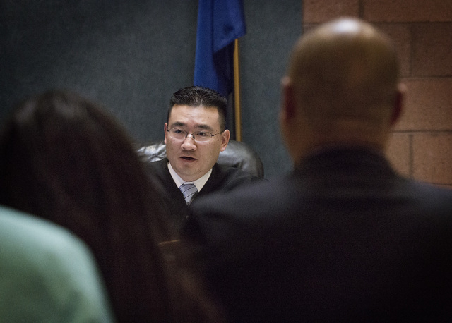 North Las Vegas Justice Court Judge Kalani Hoo speaks during a hearing for Deon Derrico, 43, father of the famed Las Vegas quintuplets, and co-defendant Olujuwon Bryant, 23, on Wednesday, April 2, 2014. They are facing 13 felony and three gross misdemeanor charges from the Nevada attorney general’s office in an alleged quitclaim title theft scam. The two are accused of forging homeowners’ signatures on deeds. The hearing was continued because Bryant changed lawyers. (Jeff Scheid/Las Vegas Review-Journal)