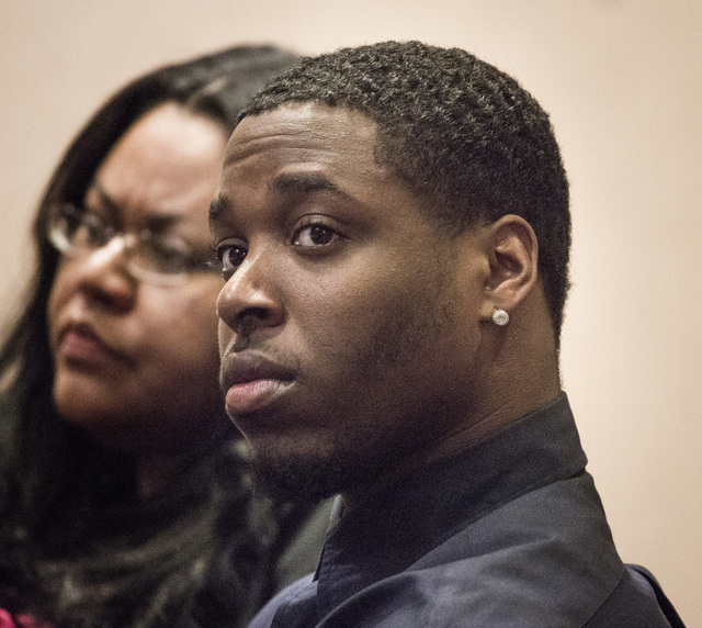 Olujuwon Bryant, 23, right, appears in North Las Vegas Justice Court on Wednesday, April 2, 2014. He appeared with co-defendant Deon Derrico, 43, father of the famed Las Vegas quintuplets. (Jeff Scheid/Las Vegas Review-Journal)