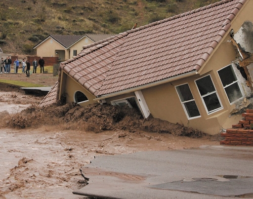 One house toppled into the wash and floated downstream about 200 yards, where it crashed into some trees, spun away and sank in the churning flow.