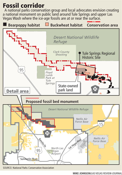 In a meeting at the Las Vegas Review-Journal, Davis and North Las Vegas Mayor Shari Buck described an urban-area monument with boardwalk access to some of the 500 sites where fossils jut from the Mojave Desert soil.