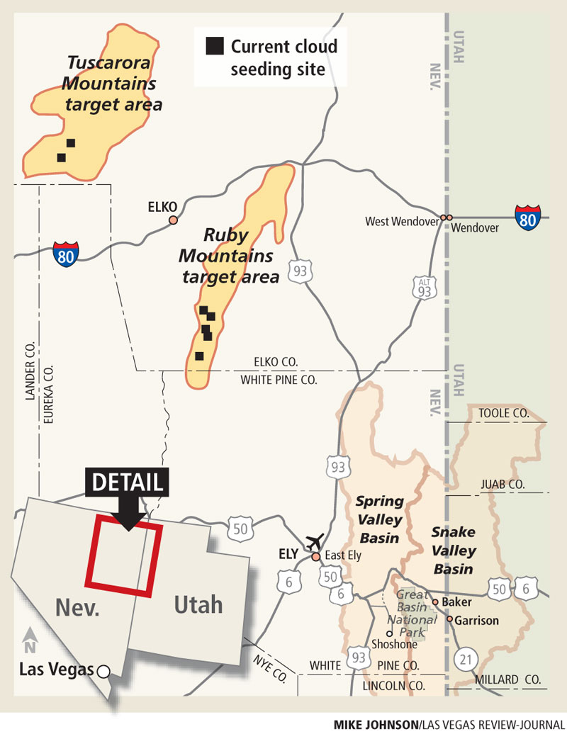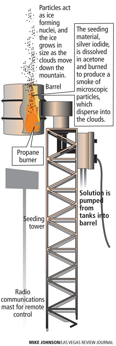 In Nevada, DRI seeds the clouds with microscopic particles of silver iodide, a compound on which ice particles readily form.