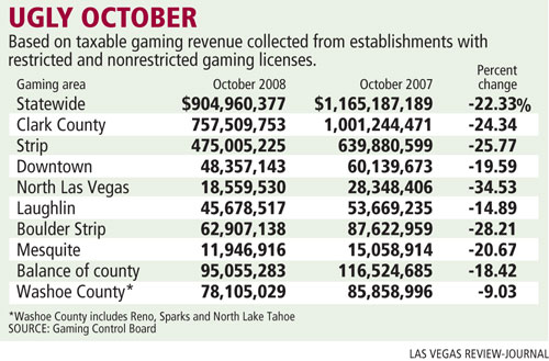Casinos statewide won just under $905 million during October, compared with $1.165 billion in October 2007, according to figures released Wednesday by the Gaming Control Board. The figure was the lowest statewide one-month total since April 2005.