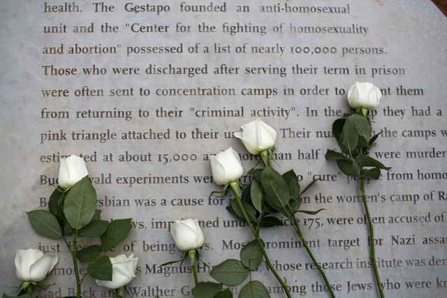 Tucked away in a Tel Aviv park, a concrete, triangle-shaped plaque details the plight of lesbian, gay, bisexual and transgender people under Adolf Hitler’s Third Reich. It resembles the pink triangles Nazis forced gays to wear in concentration camps during World War II and states in English, Hebrew and German: “In memory of those persecuted by the Nazi regime for their sexual orientation and gender identity.”