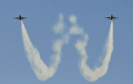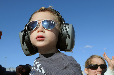 Two Thunderbird jets fly in formation Saturday at Aviation Nation at Nellis Air Force Base. The free air show attracts tens of thousands of spectators, including 2-year-old Ben Shick, who has plenty of eye and ear protection as he takes in the sights and sounds. The show continues today, with gates opening at 8:30 a.m. Parking is free at Las Vegas Motor Speedway, with free shuttle service to Nellis.