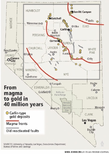 The geologists from the University of Nevada, Las Vegas, the University of Nevada, Reno and the state Bureau of Mines and Geology published a peer-reviewed model showing how these Carlin-type deposits arrived at their current locations from a journey that began in magma, or deep molten rock mixed with solids and gases.