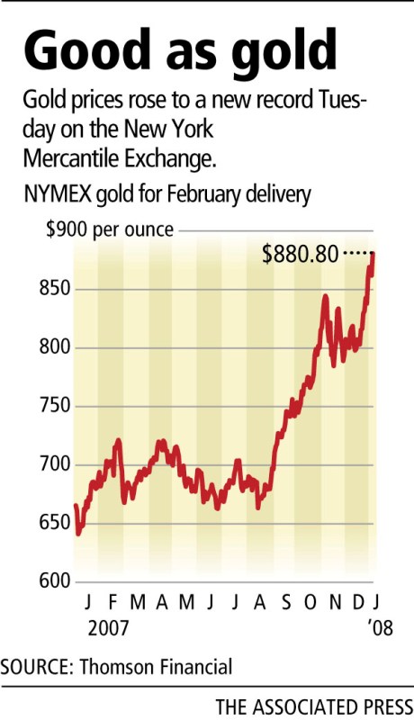 Gold that cost $650 an ounce in January 2007 has soared during the past year on rising prices for oil and other commodities and also by the falling U.S. dollar. Those trends have increased the metal’s appeal as a hedge against inflation; gold is also seen as a safe investment in times of political and economic uncertainty.