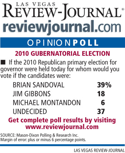 In a Republican primary match-up, Sandoval would defeat him decisively, 39 percent to 18 percent. Former North Las Vegas Mayor Michael Montandon received support from 6 percent of respondents, while 37 percent were undecided.