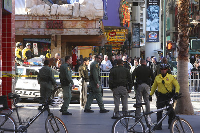 Las Vegas police Capt. William Minor said the teen, who has not been caught, fired the gun while he was standing either below or right in front of one the awnings at the Walgreens at 495 Fremont St. Five people were detained by police after the shooting, and a semi-automatic weapon was recovered. None of the detainees was arrested, Minor said.