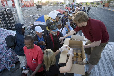 The homeless are "literally coming out of their tents for sandwiches, then going right back into their tents," said Phillip Hollon, residential services director for Catholic Charities of Southern Nevada, which operates a shelter and soup kitchen in the corridor. "When food is right in front of them, they are not reaching out for services across the street."