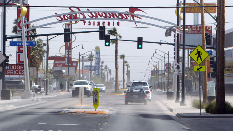 High winds and dust rolled through the Las Vegas Valley on Tuesday, March 6, 2012, obscuring the skyline and sending pedestrians scurrying for cover. The National Weather Service is predicting 70-80 mph wind gusts tin the Valley through Wednesday morning.