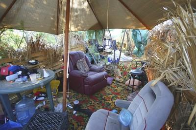 The homeless campsite that police and social workers came upon early Wednesday morning was an elaborate and cozy one, complete with an elevated mattress, lots of clothing and a makeshift place of worship nearby.
