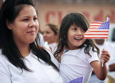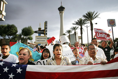 Several hundred people, many with banners and U.S. flags, took to the Strip on Friday evening in support of U.S. immigration reform with a path to legalization for an estimated 12 million illegal immigrants.