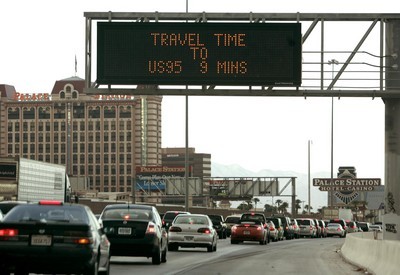 At 3:37 p.m., a sign on I-15 north near Sahara Avenue said the estimated time to U.S. Highway 95 was nine minutes.