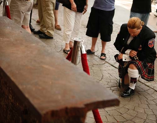 Dianne Verbout of Tampa, Fla., bit her lower lip as she crossed her arms and hugged herself. Looking at the I-beam, she flicked a tear away as she talked about the thousands of people who lost their lives that day.