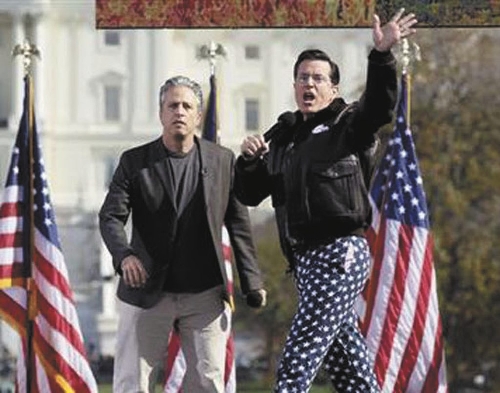 WASHINGTON -- In the shadow of the Capitol and the election, comedians Jon Stewart and Stephen Colbert entertained a huge throng Saturday at a "sanity" rally poking fun at the nation's ill-tempered politics, fear-mongers and doomsayers.