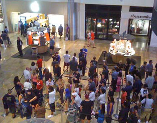 The line snakes outside the Apple Store at the Fashion Show Mall late Thursday afternoon.