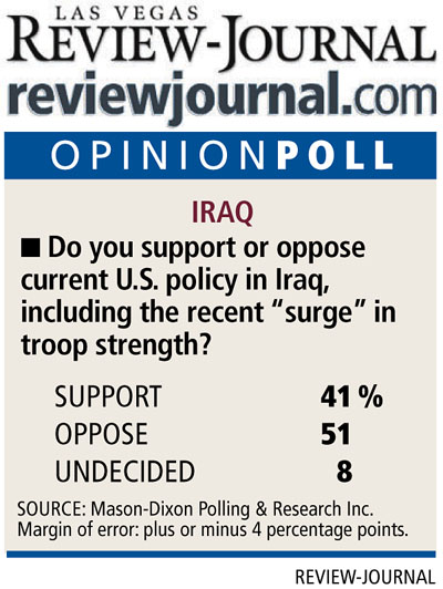 The poll, conducted for the Review-Journal by Mason-Dixon Polling & Research Inc. of Washington, D.C., found that 41 percent back Bush's Iraq policy and 51 percent oppose it, leaving 8 percent undecided.