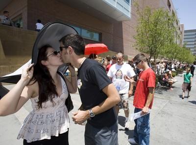 Hundreds of couples waited more than 2 1/2 hours in triple-digit temperatures outside the courthouse Friday to get marriage certificates with the fortuitous 7/7/07 date. After five people in the line passed out because of the heat before 11 a.m., court officials opened up half of the first floor of the courthouse, said spokesman Michael Sommermeyer.