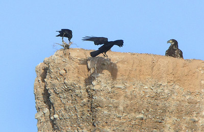 The 17th bald eagle of the day, a juvenile, was perched on a ledge beneath the top of a sandstone cliff. It seemed to be hunkered down to avoid harassment from ravens winging nearby.